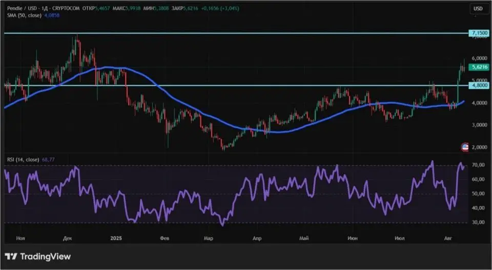 Индикаторы технического анализа говорят в пользу продолжения восходящего тренда. 6 августа цена превзошла 50-дневную скользящую среднюю (обозначена синим цветом) и с тех пор находится намного выше. Кроме того, RSI поднялся за уровень 50, но не дошел до зоны перекупленности, хотя и оказался близок. Вполне вероятно, что рост цены продолжится до уровня сопротивления около $6,5. В случае коррекции котировки Pendle могут опуститься к уровню поддержки возле $4,8.