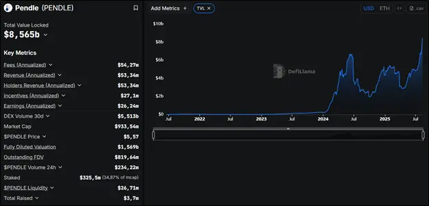 С апреля 2025 года показатель TVL — общее количество активов, заблокированных в протоколах сети Pendle — вырос в 2,96 раза. Начиная с конца июля показатель неизменно обновлял свои исторические максимумы. На сейчас пиковое значение составляет $8,565 млрд.