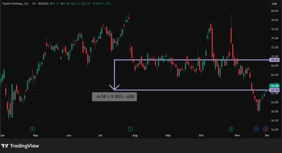 Открывает тройку лидеров платежный сервис PayPal с рыночной капитализацией $59,89. Он не только дает своим пользователям возможность расплачиваться за товары в криптовалюте, но и имеет собственный стейблкоин — PYUSD. В ноябре акции PayPal снизились на 9,5%. Снижение биткоина в меньшей степени отразилось на компании, хотя определенный эффект, конечно, присутствовал. Основная проблема PayPal — нарастание конкуренции в сегменте цифровых платежей. С начала 2025 года доля таких компаний как Visa и Mastercard увеличилась на 5,7% и 3,5% соответственно.