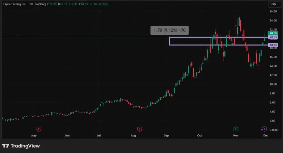 Восьмое место у компании Cipher Mining, занимающейся майнингом и высокопроизводительными вычислениями, с рыночной капитализацией $8,04 млрд. Первые две трети ноября ее акции снижались в цене, однако в конце месяца начали расти, что вылилось в 9,12% прибавки по сравнению с октябрем. Основным катализатором роста стала переоценка Cipher Mining со стороны финансового гиганта JP Morgan, который определил целевую цену для акций компании в $18 — это на 50% выше предыдущей оценки.