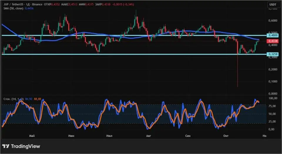Если обратиться к индикаторам, то ситуацию с JUP нельзя назвать радужной. Даже несмотря на успехи последнего времени, цена по-прежнему располагается ниже 50-дневной скользящей средней, что говорит о нисходящем тренде. Кроме того, стохастический осциллятор дошел до зоны перекупленности (выше уровня 80). Это также потенциальный сигнал к развороту. Текущие уровни поддержки и сопротивления на дневном графике: $0,3258 и $0,8 соответственно.