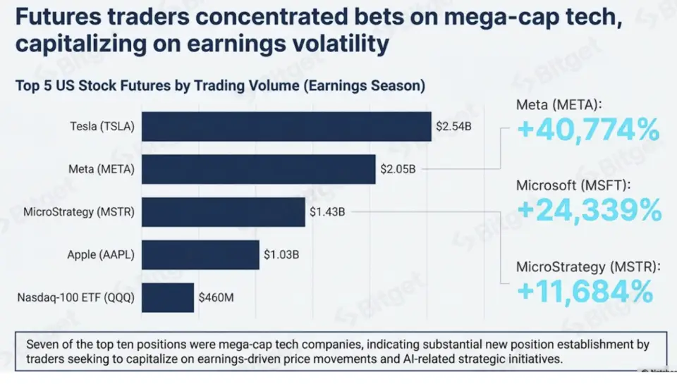 Во-первых, трейдеры активно торговали акциями американских технологических компаний и компаний, связанных с криптоиндустрией. Акции Tesla, Meta, Strategy, Apple и паи фонда Nasdaq-100 (QQQ) стали лидерами по обороту. Объем фьючерсных торгов Meta вырос на 40 774%, Microsoft — на 24 339%, а Strategy — на 11 684%.