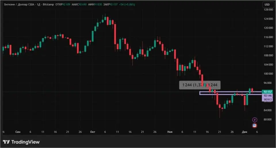 Биткоин с 28 ноября по 5 декабря 2025 года вырос на 1,37%. Несмотря на положительную динамику, инициатива чаще была у продавцов: четыре из семи торговых сессий оказались минусовыми.