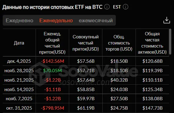 Спотовые ETF на биткоин на прошедшей неделе вновь показали отрицательную динамику. Общий отток денежных средств за четыре торговые сессии составил $142,56 млн. За последние шесть недель это уже пятая, когда инвесторы предпочитают выводить деньги из спотовых биржевых фондов на BTC. Стоит, однако, учесть: по сравнению с началом ноября, когда отток превышал $1 млрд за семь дней, показатель сократился почти в девять раз. То есть все, кто хотел забрать деньги из ETF, сделали это. В начале декабря инвесторы просто предпочитают занимать выжидательную позицию.