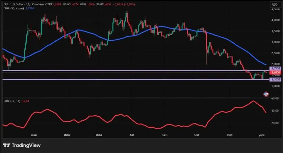 А вот с точки зрения технического анализа, ситуация у монеты остается плачевной. Тренд Sui по-прежнему нисходящий, так как цена ниже 50-дневной скользящей средней (обозначена синим цветом). Некоторый позитив придает начало падения индикатора ADX. Это говорит о снижении силы тренда. Ближайшие уровни поддержки и сопротивления на дневном графике: $1,3058 и $1,7158 соответственно.