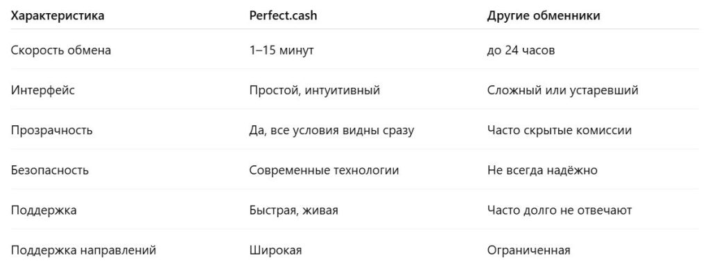 Среди множества обменных сервисов, предлагающих крипто-фиатные операции, выбрать действительно качественный не так просто. Однако Perfect.cash выгодно выделяется на фоне конкурентов — и вот почему: