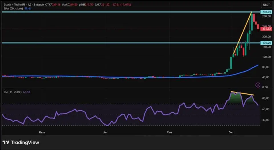 Если взглянуть на 50-дневную скользящую среднюю (обозначена синим цветом), то тренд ZEC остается восходящим, так как она намного превышает текущую цену. Тем не менее, не все так однозначно. Zcash вырос очень сильно на коротком промежутке времени без видимых откатов. Даже распродажи, вызванные угрозами Дональда Трампа по введению 100% пошлин на китайский импорт и произошедшим на этом фоне инцидентом с Binance, не сильно поколебали позиции приватной криптовалюты, относительно ее роста. Тем более высока вероятность коррекции. По сути, она уже началась, так как с максимумов от 11 октября монета просела на $70 (23,5%).