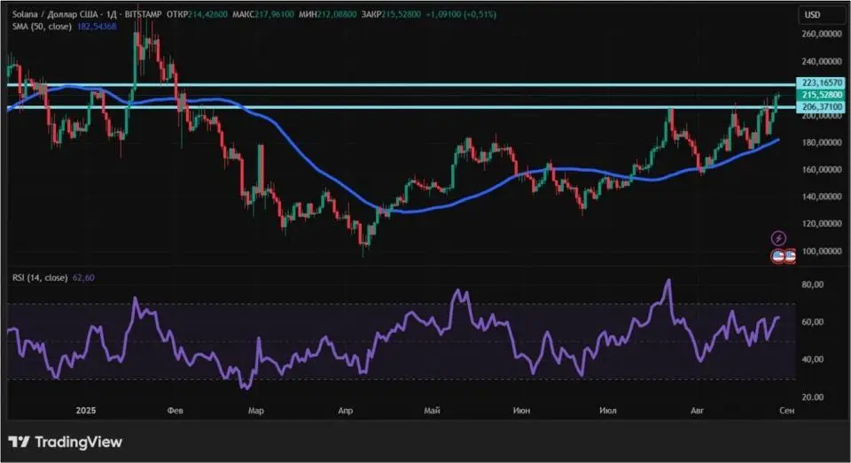 С точки зрения технического анализа, тренд Solana — восходящий. В пользу этого говорят индикаторы. Например, цена находится намного выше 50-дневной скользящей средней (обозначена синим цветом). Кроме того, осциллятор RSI вырос выше отметки 50, при этом в зону перекупленности он до сих пор не зашел. Ближайшие уровни поддержки и сопротивления на дневном графике: $206,4 и $223,2 соответственно.