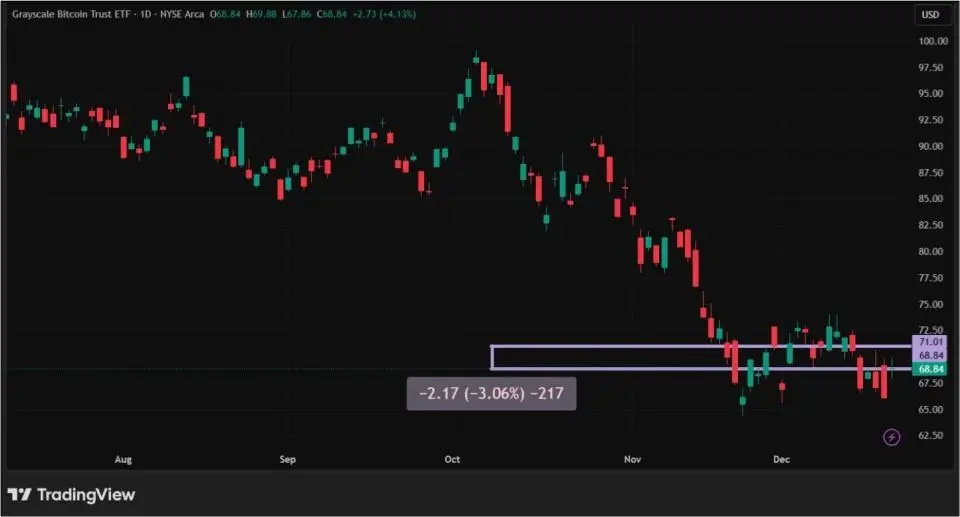 Спотовый ETF от компании Grayscale — Grayscale Bitcoin Trust — занимает четвертое место с рыночной капитализацией $47,66 млрд. Три недели декабря принесли снижение его акциям (паям) в размере 3,06%. GBTC продолжает фиксировать отток денежных средств. Суммарно с 1 по 20 декабря инвесторы вывели из фонда $96,04 млн. Притоком была отмечена лишь одна торговая сессия 9 декабря — тогда инвесторы внесли $17,48 млн. Для акций GBTC основная проблема последнего квартала 2025 года — не робкие действия ФРС относительно ставки, а падение биткоина со своего исторического максимума более чем на 30%. Главная причина продолжающегося оттока средств из GBTC — высокие по сравнению с конкурентами комиссии.