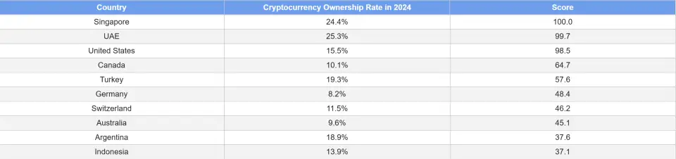 Рейтинг стран возглавляет Сингапур, набравший 100 баллов. В городе-государстве криптовалютой владеют более 24% жителей, что вдвое больше, чем годом ранее (11%). По степени поисковой активности населения Сингапур также лидирует с 2000 запросами на 100 000 человек.
