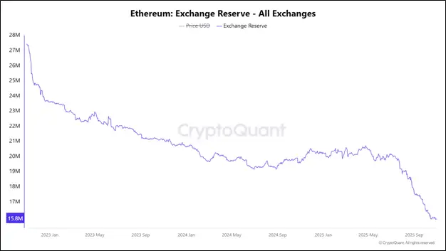 О том, что инвесторам, вложившимся в эфир, рано посыпать голову пеплом, говорят запасы монеты на криптобиржах. Как следует из данных аналитической платформы CryptoQuant, на конец октября 2025 года показатель продолжает обновлять свои минимумы, опустившись ниже 15,9 млн ETH.