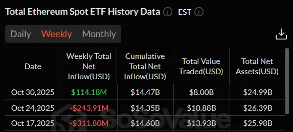 Спотовые ETF на эфир прервали двухнедельную негативную динамику, когда фиксировался отток денежных средств. За последние четыре торговые сессии инвесторы внесли в биржевые фонды на ETH на $114,18 млн больше, чем вывели. Вместе с тем, показатель относительно начала октября, когда приток денежных средств превышал $1 млрд, намного ниже. Это говорит об убавившейся уверенности инвесторов в отношении эфира.