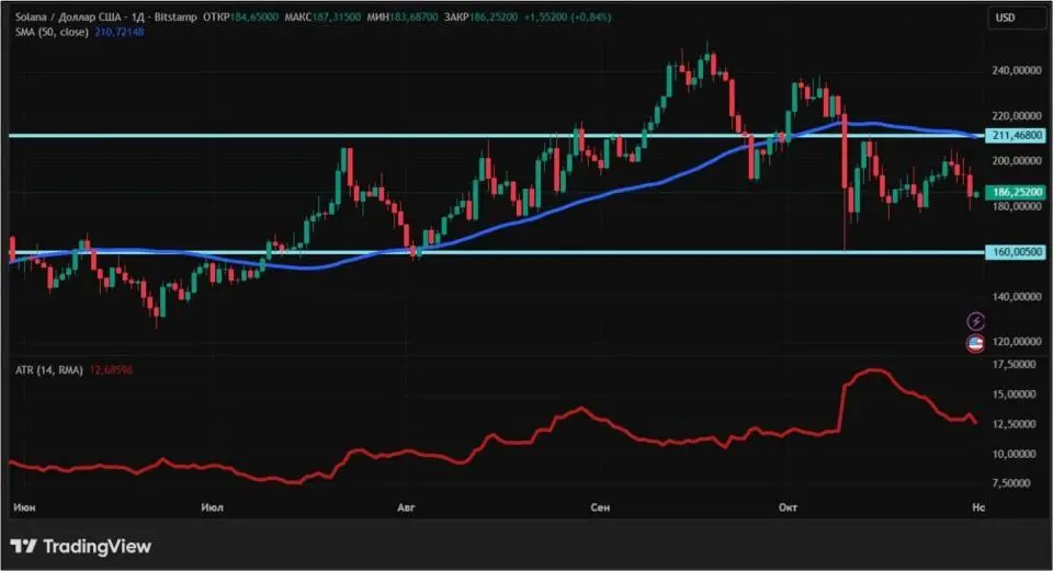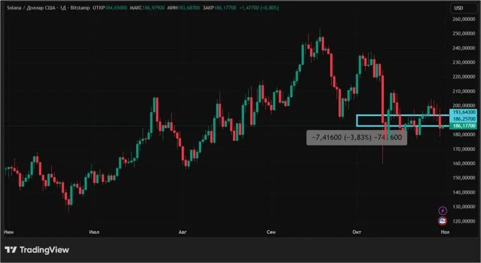 Solana с 24 по 31 октября подешевела на 3,83%. Закрепиться выше психологически важной отметки $200 не удалось. За последние двадцать торговых сессий стоимость Solana в десяти случаях росла и столько же раз падала.