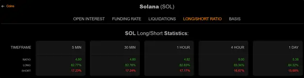 Одной из основных причин снижения Solana стала распродажа 1,1 млн SOL на $205 млн инвестиционной компанией Jump Crypto. Компания решила вывести деньги, чтобы купить биткоин на $265 млн. Тем не менее, рядовая коррекция явно не обескуражила криптоинвесторов. Если посмотреть соотношение длинных и коротких позиций, то первых сейчас в пять раз больше, чем вторых.